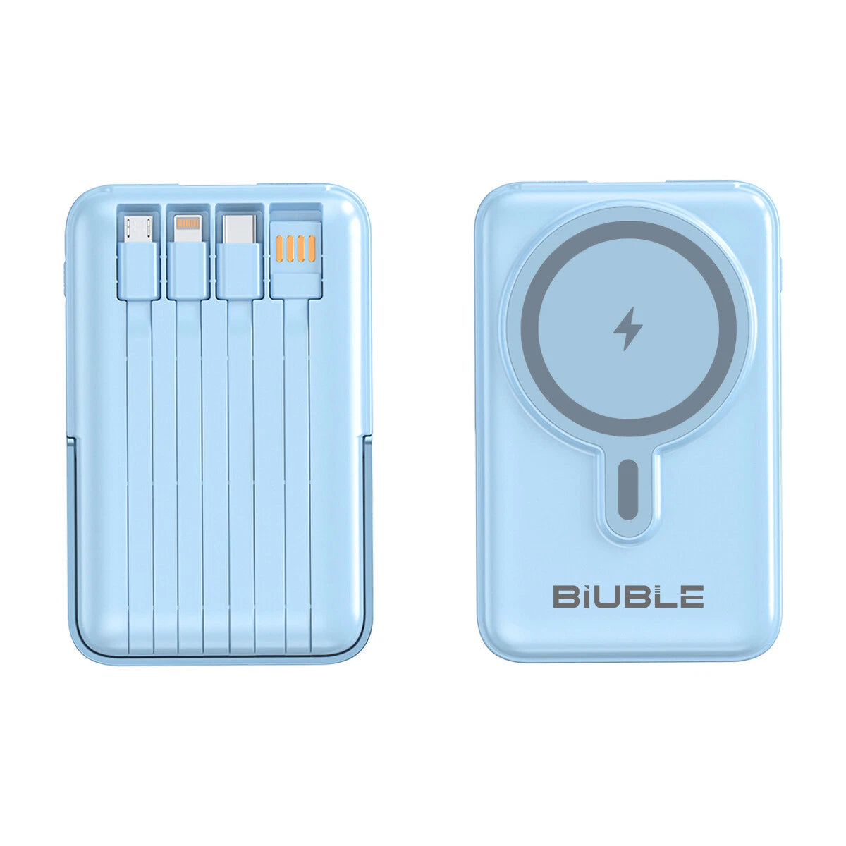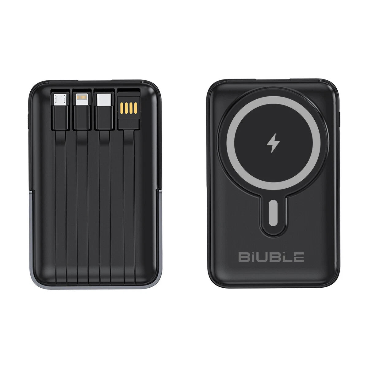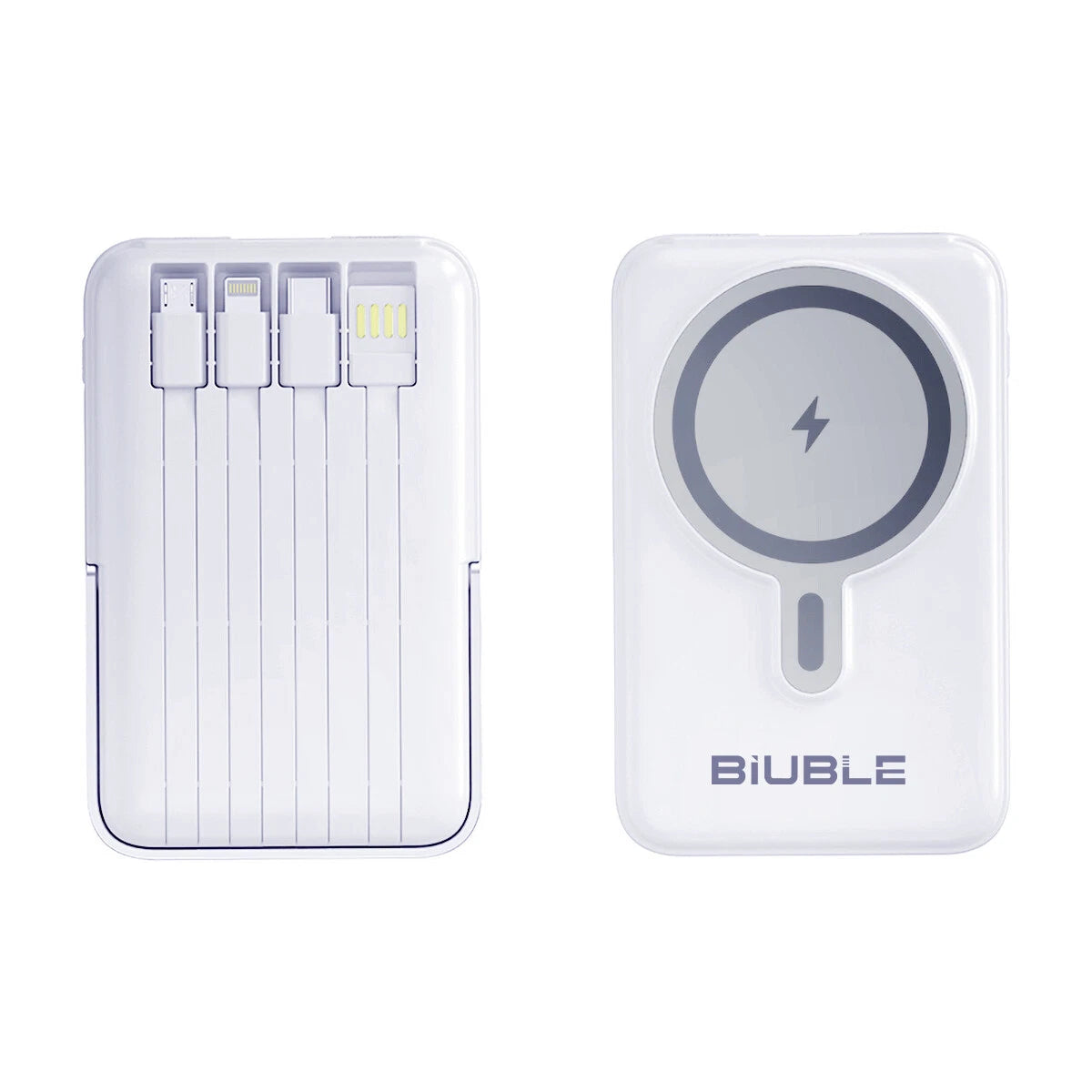 The Biuble wireless magnetic power bank works with all Apple, Samsung, and Android devices that support wireless charging. It delivers fast wireless charging up to 22.5W, plus 22.5W wired charging through USB-A. You can charge up to three devices at once, both wired and wirelessly.
